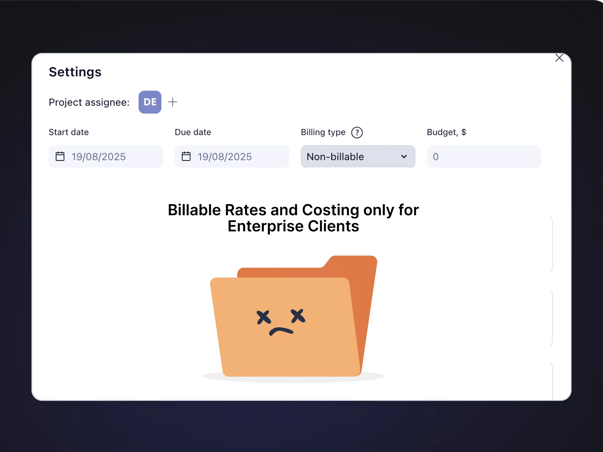 Timesheets, billable time and rates are available at project and global level on paid plans and not homed under expensive Enterprise tier
