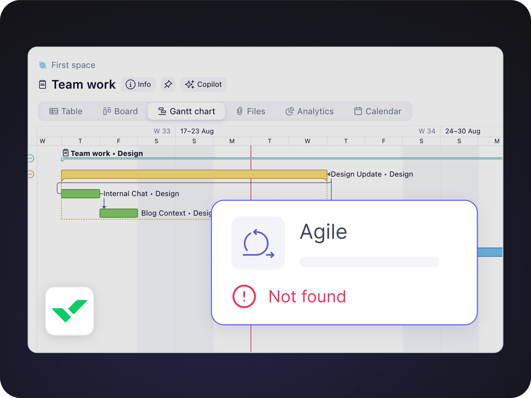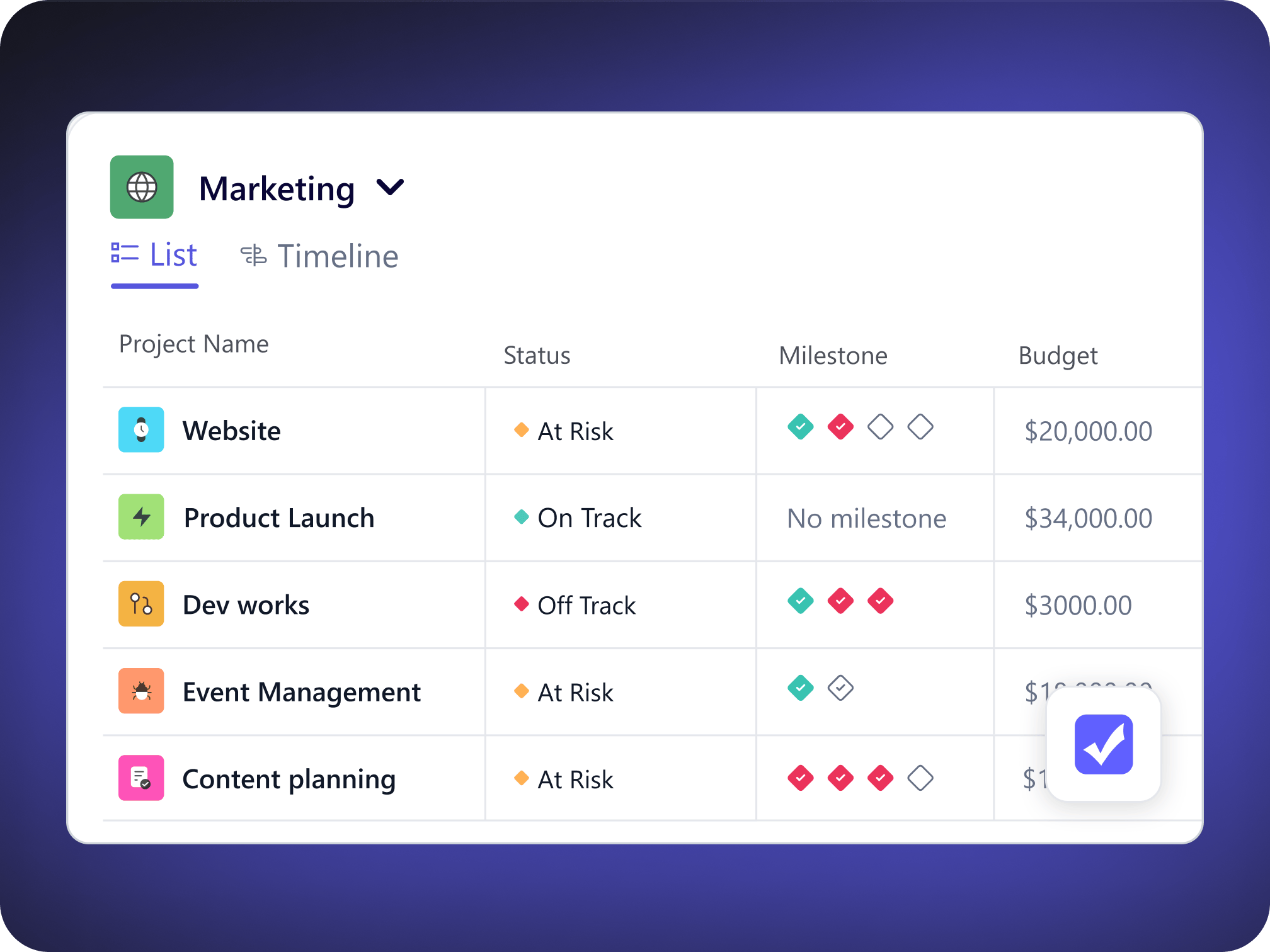 Get quick overview of running projects by team or manager. With data points like milestone progress, billing details and status updates. Further add more details with custom columns